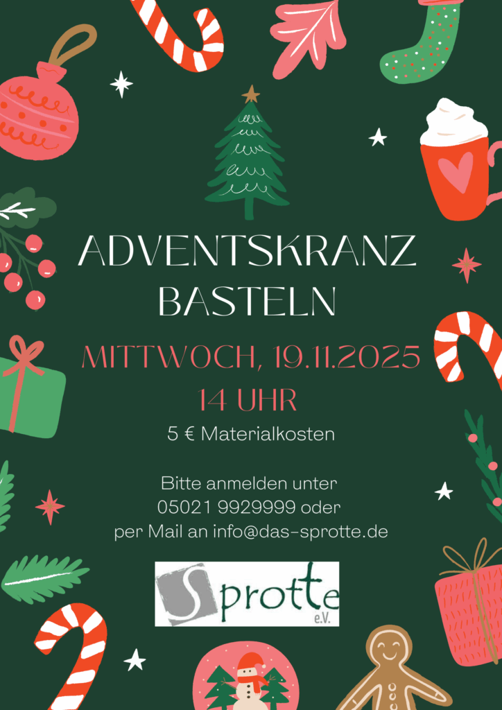 🎨 Im Sprotte duftet es nach Tannengrün und Keksen: Beim Adventsbasteln am 19.11.entstehen liebevoll gestaltete Kränze und kleine Kunstwerke. Eine wunderbare Gelegenheit, kreativ zu werden, ins Gespräch zu kommen und sich gemeinsam auf die Adventszeit einzustimmen.
